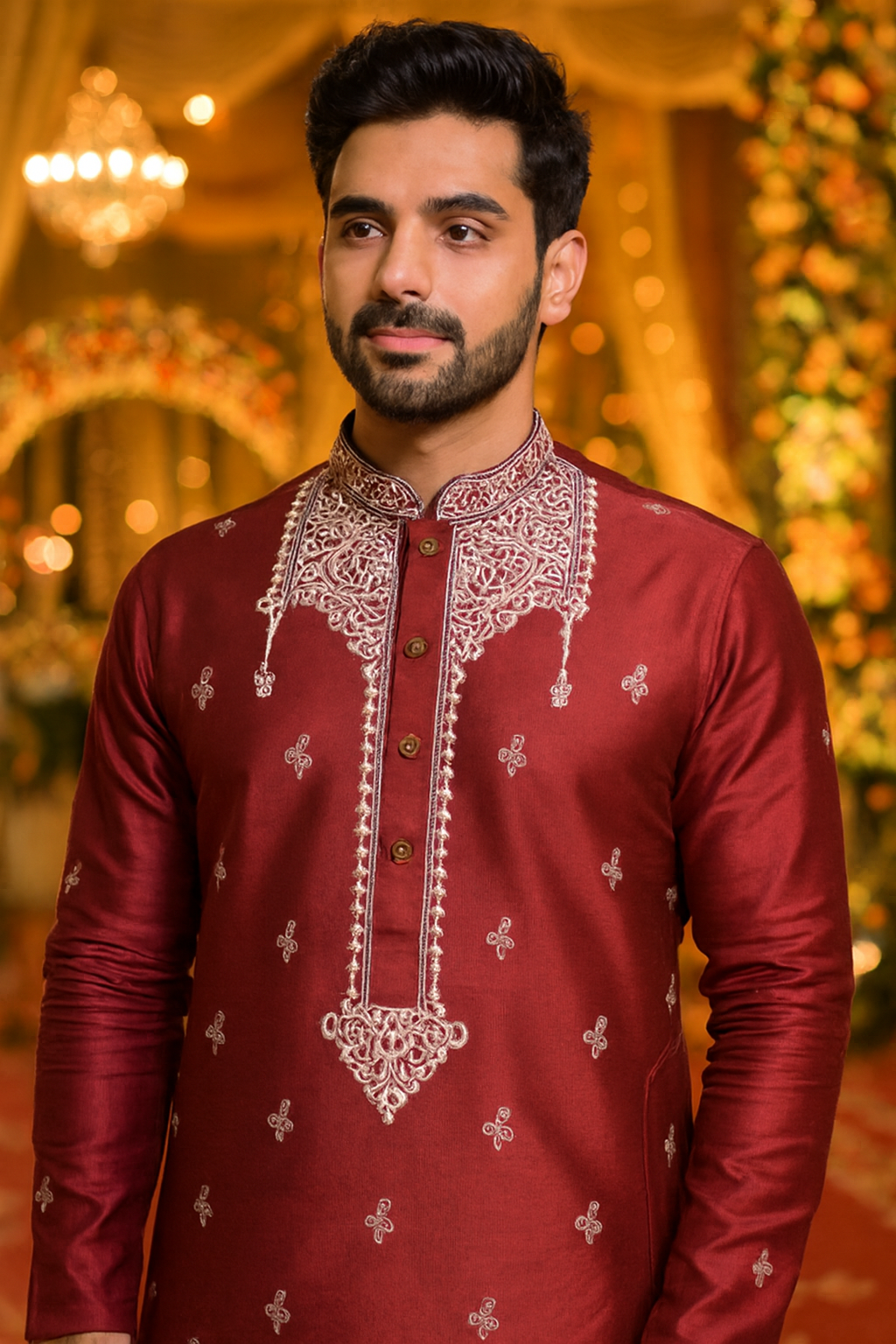 This is an elegant dupion silk embroidered kurta for men